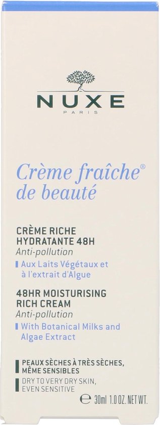Nuxe CrA me FraA r che de BeautA c CrA me Riche Hydratante 48h 48hr Moisturising Rich Cream Een romige crA me met een unieke combinatie van Plantaardige Melksappen en Algenextract De crA me biedt 48h hydratatie Daarnaast kalmeert en beschermt de crA me de huid tegen luchtvervuiling De huid is de hele dag fris en voelt fluweelzacht aan Tot slot zorgt de crA me voor een intense voeding van de huid Gebruik s Morgens en of s avonds op het gezicht en de hals aanbrengen