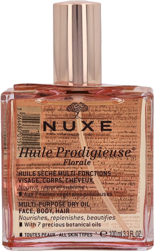 Nuxe Huile Prodigieuse Florale Multifunctionele Droge Olie is geschikt voor alle huidtypen Zorgt voor een extra stralende huid en haar Bevat 96 9 aan natuurlijke ingredienten Gebruik sprayen op gelaat lichaam en haar