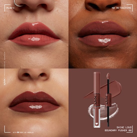 16h LOUD SHINE LIP COLOR! Maak kennis met onze eerste ultra-gepigmenteerde high-shine lipkleur, die 16 uur lang perfect blijft zitten. Deze vegan lipkleur van NYX Professional Makeup voelt licht en comfortabel op je lippen. Door deze super gepigmenteerde formule heb je ultra-glossy, plakkende en opvallende lippen in één beweging. Makkelijke twee-stappen technologie Combineer de gepigmenteerde base coat – die lip verzorgende oliën* bevat – met de ultra shiny & niet-plakkende top coat** voor de meest opvallende glans die je ooit hebt gezien! 16 uur Lang Perfectie Zoen, drink, hair flip en zelfs onder je mondmasker. Onder al deze omstandigheden zal je lipkleur je niet in de steek laten! *bevat macademia olie, korianderfruitolie, jojoba olie, abrikozenpit olie en passievrucht zaad olie **bevat vitamine E