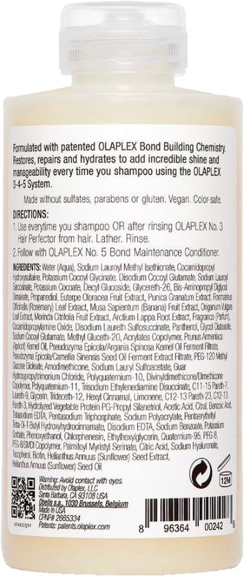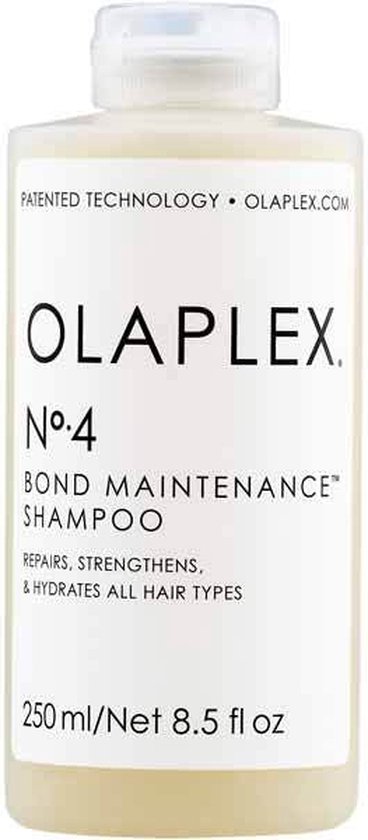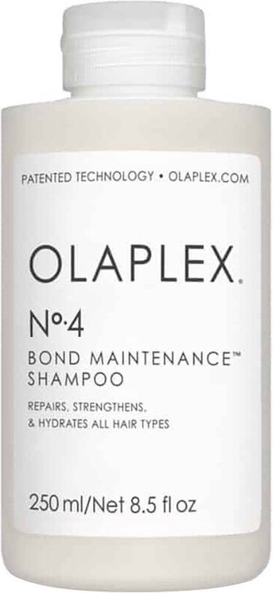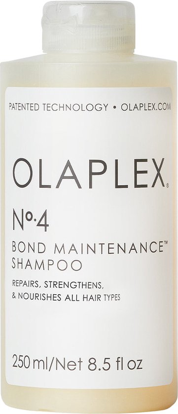 Olaplex No.4 Bond Maintenance Shampoo reinigt en hydrateert het haar. De shampoo is geschikt voor chemisch behandeld haar, dat wel wat verzorging kan gebruiken. Olaplex No.4 Bond Maintenance Shampoo verbetert zichtbaar de interne haarstructuur en geeft het haar iedere wasbeurt weer een intense glans. Verder verbetert de shampoo de handelbaarheid van het haar en verbindt het de verbroken zwavelbruggen met elkaar. De formule is verrijkt met een gepatenteerd OLAPLEX Bond Builiding Chemistry die het haar herstelt, verbetert en hydrateert. Dit concept is wetenschappelijk getest op effectiviteit. Verder is de formule 100% vegan en vrij van sulfaten, parabenen en gluten. De shampoo tast de kleur van het haar niet aan!