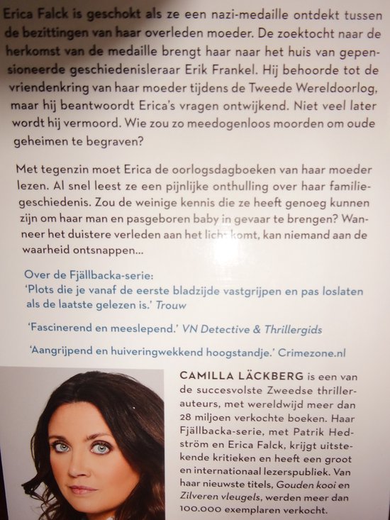 Erica Falck is geschokt als ze een nazi-medaille ontdekt tussen de bezittingen van haar overleden moeder. De zoektocht naar de herkomst van de medaille brengt Erica naar het huis van gepensioneerde geschiedenisleraar Erik Frankel. Hij behoorde tot de vriendenkring van haar moeder tijdens de Tweede Wereldoorlog, maar hij beantwoordt Erica’s vragen ontwijkend. Niet veel later wordt hij vermoord. Wie zou zo meedogenloos moorden om oude geheimen te begraven? Met tegenzin moet Erica de oorlogsdagboeken van haar moeder lezen. Al snel leest ze een pijnlijke onthulling over haar familiegeschiedenis. Zou de weinige kennis die ze heeft genoeg kunnen zijn om haar man en pasgeboren baby in gevaar te brengen? Wanneer het duistere verleden aan het licht komt, kan niemand aan de waarheid ontsnappen… Toon minder