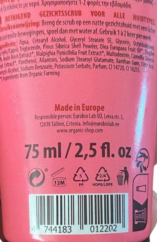 – Gebruiksaanwijzing: masseer de scrub zachtjes in op een vochtige huid, dan spoel het af met lauw water. Doe dit 1a 2 keer/week.