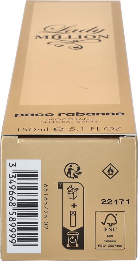 Deze Deodorant spray van Paco Rabanne is gebaseerd op de Lady Million lijn Een bloemige geur voor dames met Framboos Neroli en Amalfi citroen als topnoten Een verfrissende geur en tegelijkertijd een fris gevoel met deze deodorant van Paco Rabanne Bevat parfumextracten