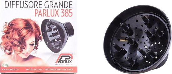 De Parlux-diffusers zijn speciaal ontworpen voor Parlux-haardroger, voor volumineuze en natuurlijke kapsels. Dankzij de vele kwaliteit van de Parlux Diffusers kun je perfecte krullen krijgen om aan elke behoefte te voldoen. De nieuwe optionele professionele luchtverspreider 385 is speciaal ontworpen om alleen aan de Parlux 385 haardrogers te worden bevestigd met een snelle, precieze en veilige hechting, voor volumineuze en natuurlijke kapsels. Belangrijke note: 385-diffuser kan alleen worden gebruikt met Parlux 385-haardrogers.