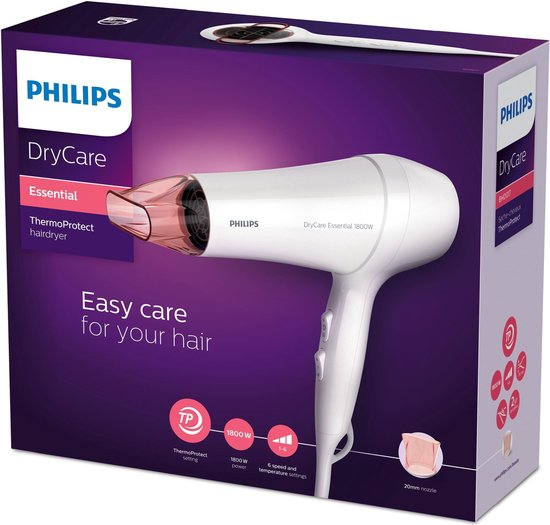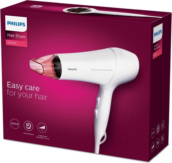 Le sèche-cheveux Philips ThermoProtect Essential 1 800 W vous permet de vous sécher rapidement les cheveux, tout en les protégeant encore mieux grâce à la fonction ThermoProtect. Avec ses 6 réglages de température et de vitesse, il est conçu pour répondre à tous les besoins en matière de séchage.
