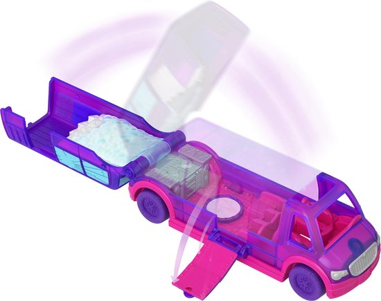 Kom mee spelen bij ons in Pollyville, het thuisstadje van Polly Pocket waar je grote verrassingen te wachten staan! Met de Pollyville Feestlimousine hebben Lila en haar vriendinnen het perfecte vervoersmiddel om door de straten van Pollyville te cruisen – ze kunnen hiermee een rijdend feest organiseren! De Feestlimousine bevat een verrassing: de auto transformeert in een dansgedeelte met ronddraaiende dansvloer en een DJ-cabine. Er is zelfs een bubbelbad waarin Lila en haar vriendinnen lekker kunnen ontspannen, plus ballonnen en een feesttaart! Lila micropop en vriendinnen kunnen zich uitleven met coole dansmoves en dan bijkomen in het bubbelbad! Fantastische party! Bij de Feestlimousine zit een Lila micropop in een schattige feestoutfit, een verborgen schatplek, 3 accessoires en een stickervel. Dankzij de Polly Stick technologie kun je Lila en haar vriendinnen overal neerzetten! Plak een sticker van het stickervel (meegeleverd) op het speelgebied en het poppetje kun je dan op die plek neerzetten. Verzin nog veel meer verhalen terwijl je je eigen wereld bouwt en aanpast met de favoriete kleine plekjes en voertuigen van Pollly Pocket in Pollyville! Verzamel ze allemaal! Per stuk verkrijgbaar en niet overal leverbaar. Afwijkende kleuren en versieringen mogelijk. 4 jaar en ouder.