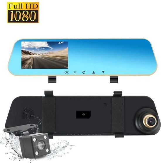Full HD auto dashcam spiegel, autoblackbox DVR, voor en achter camera.