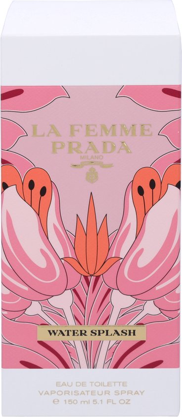 Prada La Femme Water Splash is een fleurige geur. De geur is een mix van mandarijnenblad, plumeria, magnolia en lelietje-van-dalen. De basis bestaat uit groene akkoorden en sandelhout.-Prada La Femme Water Splash Eau de toilette spray 150 ml
