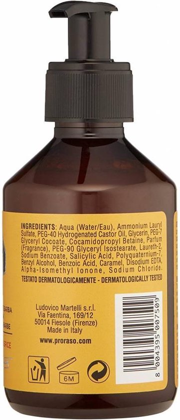 Proraso Beard Wash Wood And Spice is een reinigende shampoo voor de baard en de onderliggende huid, deze wash geeft een fris en zacht resultaat en een heerlijke geur. De Beard Wash verwijdert vuil en resten van baardproducten uit de baard.De productenuit de Wood and Spice lijn hebben een mannelijke, kruidige, houtachtige geur. Proraso is een Italiaans merk met meer dan 100 jaar ervaring met het ontwikkelen van scheer- en verzorgingsproducten voor de man met baard. Dit merk gebruikt enkel de beste ingrediënten.