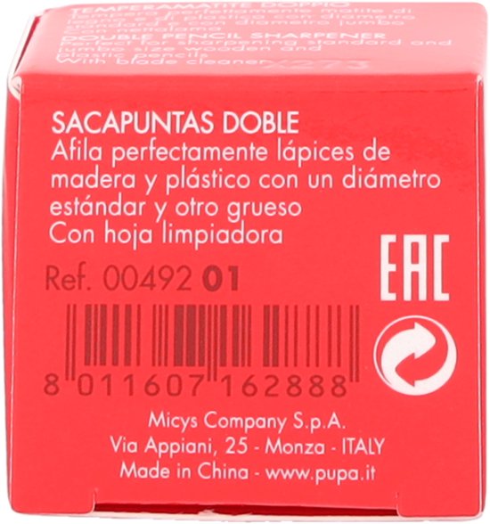 Een streek met een oogpotlood is precies en gedefinieerd als het potlood een perfecte punt heeft. De Pupa puntenslijper is dubbel en scherpt zowel potloden met een standaarddiameter als een jumbodiameter. Het werkt met houten potloden maar ook met plastic potloden.
