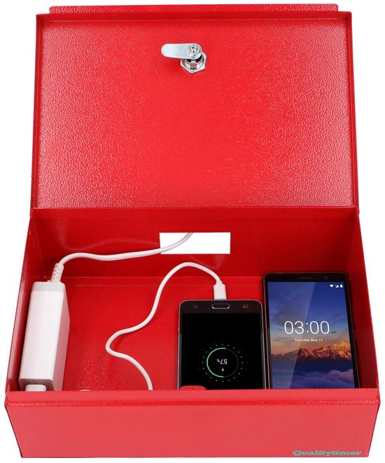 Wat is de Qualitytimer: afsluitbare doos met een hoogwaardige oplader voor (max) 5 mobiele telefoons of tablets met een maximale afmeting van 27×17,5x10cm
