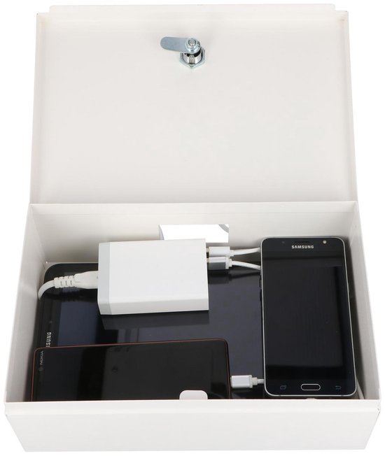 Wat is de Qualitytimer: afsluitbare doos met een hoogwaardige oplader voor (max) 5 mobiele telefoons of tablets met een maximale afmeting van 27×17,5x10cm