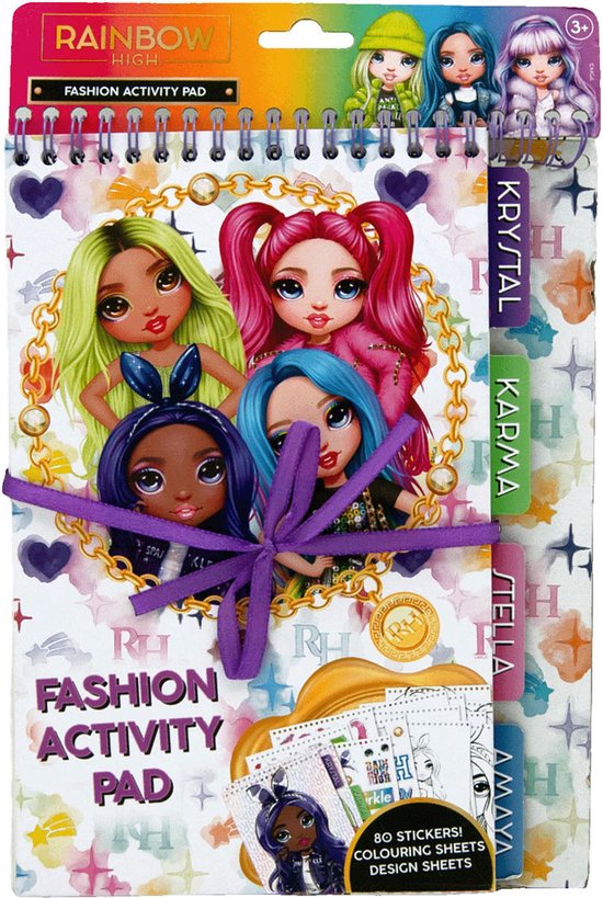 Rainbow High Mode Ontwerpboek met 28 design sheets, 12 kleurplaten en 80 stickers van de modieuze Rainbow High-meiden Krystal, Karma, Stella en Amaya. Geschikt voor kinderen vanaf 3 jaar oud.