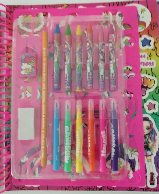 Rainbow Surprise Super Style Album- Met Viltstiften – Krijtjes – Gum – Potlood – Puntenslijper – Sjablonen – Stickers