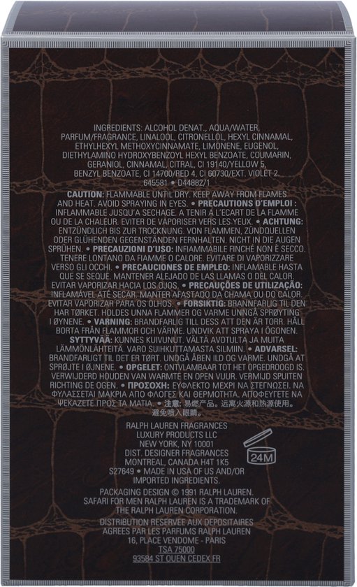 Safari door Ralph Lauren. Ralph Lauren Safari is geïntroduceerd door het designhuis van Ralph Lauren in 1992 als een verfrissend en pittig parfum van amber en lavendel. Dit mannelijke parfum bevat een mix van limoen, lavendel, leer, kaneel, schorsmos en sandelhout. Safari van Ralph Lauren is een ideale parfum te gebruiken voor overdag.