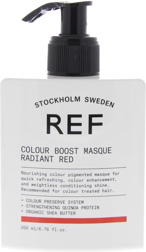 De REF Colour Boost Masque is een intensief masker speciaal voor gekleurd haar. Met dit masker zal de haarkleur worden beschermd. Dit masker biedt een intensieve verzorging en is verkrijgbaar in verschillende kleuren zodat er voor iedere haarkleur een juist masker te vinden is. Het masker is ontwikkeld op basis van quinoa proteïne en beschikt over UV-filter waardoor het haar beschermd wordt tegen schadelijke straling van de zon. Bovendien is het masker vrij van sulfaten, parabenen en siliconen.