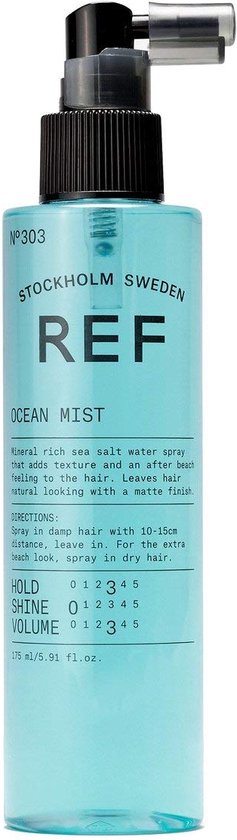 REF Ocean Mist is een zoutwater spray om de perfecte beachlook mee te creëren. Deze spray werkt perfect om een matte, warrige look te creëren. De spray is gemakkelijk uit het haar te wassen of te borstelen en is daarom erg fijn in gebruik. Het haar krijgt extra structuur door de spray van REF. Tevens wordt pluis aanzienlijk verminderd. De spray geeft een medium tot sterke hold. REF Ocean Mist is geschikt voor alle haartypen en heeft een frisse geur.