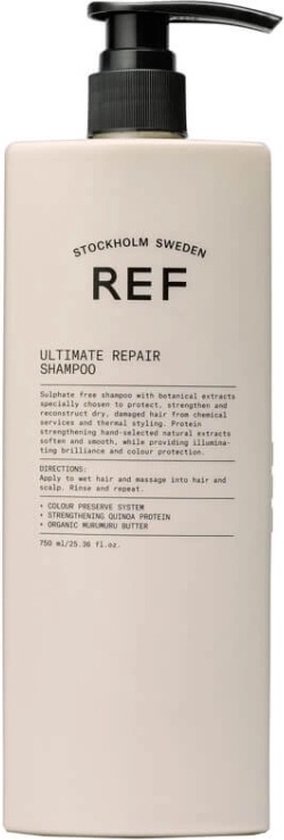 REF Ultimate Repair Shampoo is een shampoo die ervoor zorgt dat droog en beschadigd haar weer een nieuw leven in wordt geblazen. Deze shampoo beschikt namelijk over een speciale formule van plantaardige extracten, zoals bosbessen, walnoot, tamanu en arganolie, dat ervoor zorgt dat het beschadigde haar weer helemaal wordt hersteld en er weer verzorgd en gezond uit ziet. De REF Ultimate Repair Shampoo is in combinatie te gebruiken met de REF Ultimate Repair Conditioner voor een optimaal herstellend resultaat. De shampoo is vrij van SLS en parabenen.