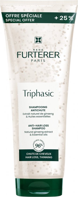 René Furterer Triphasic Anti-Hair Loss Shampoo 250 ml 25% Gratis is een shampoo met een unieke textuur en biosferen van essentiële oliën. Het stimuleert de hoofdhuid op milde wijze en helpt de haargroei te versterken en te bevorderen.Samengesteld met natuurlijke extracten van organische Pfaffia en ginseng, bevordert het een sterkere, gezondere haargroei. Haaruitval wordt verminderd en het haar is dichter. Het haar is dikker, sterker, gehydrateerd, zacht en glanzend.