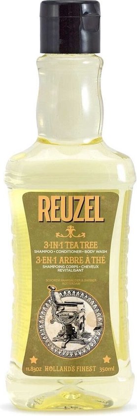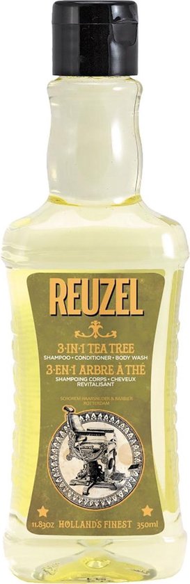 Reuzel 3-in-1 Tea Tree is zoals de naam al zegt een Shampoo, Conditioner & Body Wash in 1. Deze is perfect voor het verzorgen van de hoofdhuid en het lichaam en kan dagelijks worden gebruikt. Een heerlijke mannelijke geur komt vrij terwijl het haar wordt gereinigd en de hoofdhuid wordt verzorgd. Er blijft geen residu achter.