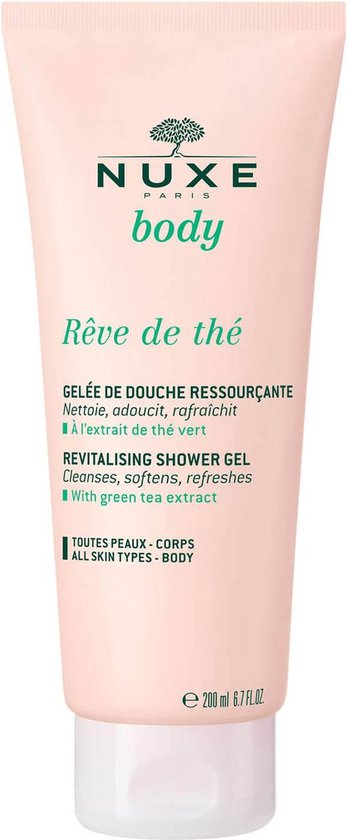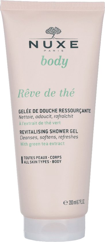 Deze verkwikkende douchegel is verrijkt met de RAave de ThA c geur Deze geur bevat tonen van Rabarber Groene Thee en verse kruiden Deze verkwikkende douchegel verzacht reinigt en verfrist de huid De textuur van het product verandert in een fijn schuim waardoor het zeer gemakkelijk af te spoelen is Het product bevat maar liefst 95 natuurlijke ingrediA