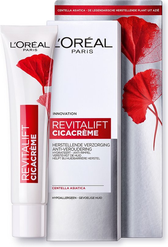 Ontdek de eerste kalmerende anti-rimpelcrème van L’Oréal Paris voor natuurlijk herstel van de huidbarrière. De dagcrème beschermt de huid tegen invloeden van buitenaf die schade kunnen aanbrengen aan de huid en tekenen van veroudering kunnen versnellen. Revitalift Cicacrème is verrijkt met Centella Asiatica-extract. Dit eeuwenoude ingrediënt uit de Chinese geneeskunde staat in Azië bekend als “tijgerkruid’, omdat Aziatische tijgers erin rollen om hun wonden te kalmeren en herstellen. Dit product is geschikt voor de gevoelige huid en is aanbevolen voor vrouwen vanaf 30 jaar.