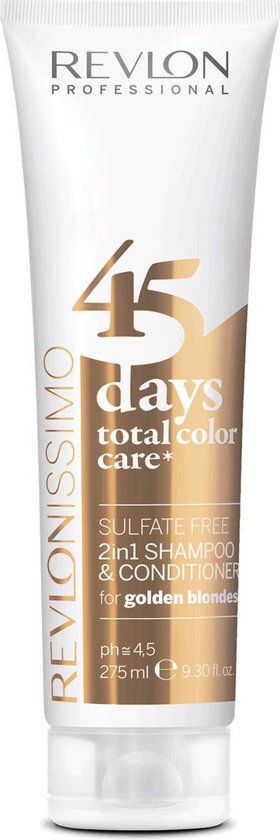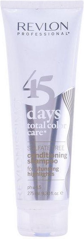 Revlon Professional 45 Days Conditioning Shampoo is een combinatie van shampoo en conditioner speciaal voor gekleurd haar. Het product zorgt voor zacht en gezond haar met een mooie volle kleur. Revlon Professional 45 Days Conditioning Shampoo compenseert voor het verlies van de kleur door bijvoorbeeld wassen of UV-straling. De conditionerende shampoo is verkrijgbaar in Ice Blondes, Golden Blondes, Stunning Highlights en Sensual Brunettes.