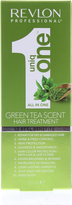 Revlon Uniq One Green Tea Treatment is een intensieve behandeling voor beschadigd haar. De naam zegt het het al, deze biedt tien fantastische voordelen die zorgen voor subliem, verbluffend, gezond en beschermd haar. Uniq One geeft 10 fantastische effecten / resultaten;