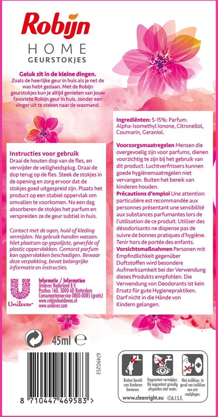 Robijn Home Geurstokjes de weelderige bloemengeur van Pink Sensation verspreiden het parfum subtiel in huis. Zo kun je altijd genieten van jouw favoriete Robijn geur, zonder een vinger uit te steken naar de wasmand. Robijn staat al jaren bekend om de lekkere geuren voor de was. Deze parfums zijn ook uitermate geschikt om voor meer frisheid te zorgen in de rest van het huis. De natuurlijke rotanstokjes verspreiden de geur subtiel in huis, zodat jij in een heerlijk fris huis thuis komt. Het stijlvolle flesje met geurstokjes staat mooi in ieder interieur. Perfect voor gebruik in de woonkamer, slaapkamer en badkamer. Probeer voor de afwisseling ook eens de andere geuren: Morgenfris en Zwitsal.