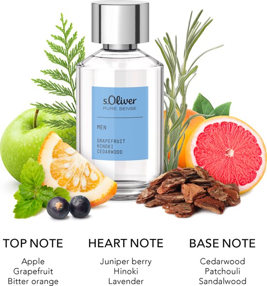 Natuurlijk, levendig en mannelijk: s.Oliver Pure Sense for Him Eau de Toilette onderstreept de onvervalste authenticiteit van moderne en natuurminnende mannen. De fruitige frisheid van appel, grapefruit en bittere sinaasappel wordt gecombineerd met heldere, kruidige, kenmerkende tonen van jeneverbes, hinoki en eikenmos. Ceder, sandelhout en patchouli geven de warme, sensuele en natuurlijk mannelijke geurnoot van deze heldere, frisse en natuurlijk mannelijke veganistische herengeur voor echte mannen.