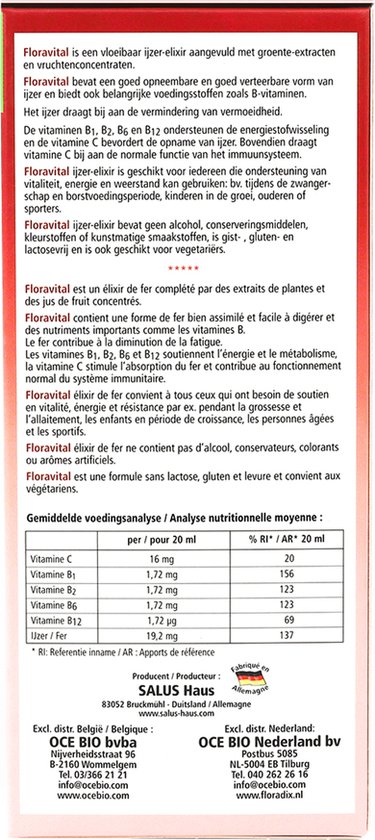 Salus Floradix Floravital – Vitaminen – Vegan ijzer-elixir met groente vruchten – Glutenvrij – 250ml