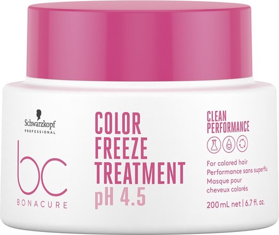 Schwarzkopf Bonacure Clean Performance Color Freeze Treatment is een herstellende, smeuïge haar behandeling van Bonacure Color Freeze met een speciale formule voor gekleurd haar! Op zoek naar de beste behandeling voor gekleurd haar? Stop met zoeken! Dit fijne treatment beschermt en herstelt jouw haren op intensieve wijze, en tegelijkertijd maximaliseert het het kleurbehoud. Het haar wordt hersteld naar de optimale pH-waarde om de kleurpigmenten in de binnenste van het haar perfect te bevriezen en vervaging te voorkomen voor een langdurige haarkleur. Klinkt als een echte musthave voor jouw gekleurde haren toch?