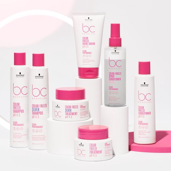 Een evenwichtige pH-waarde van de huid is van het grootste belang voor het behoud van een gezonde conditie. Uit onderzoek is uitgewezen dat de levensduur van de haarkleur ook vooral baat kan hebben bij producten die het haar op een optimale pH 4,5 brengen. Niet alleen goed voor de huid dus, maar ook voor het kleurbehoud van jouw haren! Gelukkig zijn de professionele Bonacure Color Freeze producten geformuleerd met pH 4,5. Hierdoor brengen deze fijne producten jouw haarstructuur weer in balans tot een optimale pH waarde en wordt de haarkleur beschermt met bijna nul vervaging!