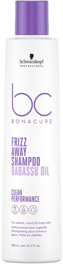 Schwarzkopf Bonacure Frizz Away Shampoo is een sulfaatvrije shampoo die pluizig haar vermindert. Deze vegan shampoo is speciaal ontwikkeld om weerbarstig haar mild, maar effectief te reinigen. Het haaroppervlak wordt geëgaliseerd en verzacht waardoor pluis tot 72 uur effectief wordt verminderd. De formule bevat babassu-olie om de elasticiteit en glans van het haar verbeteren. Babassu-olie is rijk aan antioxidanten en houdt vocht vast zodat het haar glad en pluisvrij wordt.