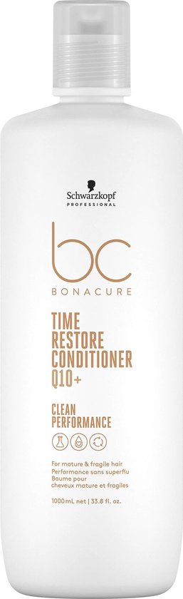 Schwarzkopf Bonacure Clean Performance Restore Time Conditioner reactiveert de productie van keratine en herstelt de inwendige structuur van beschadigd haar. Deze conditioner legt een ultra zachte laag over je haar en egaliseert je haaroppervlak. Hierdoor is je haar zijdezacht en aanzienlijk makkelijker handelbaar. De conditioner verzorgt breekbaar, droog haar en geeft het extra body. De Q10 reactiveert de productie van twee belangrijke keratines. Aminozuren herstellen de inwendige structuur en penetreert diep in het haar. Het collageen stimuleert de opvulling van beschadigde delen in de haarstructuur.
