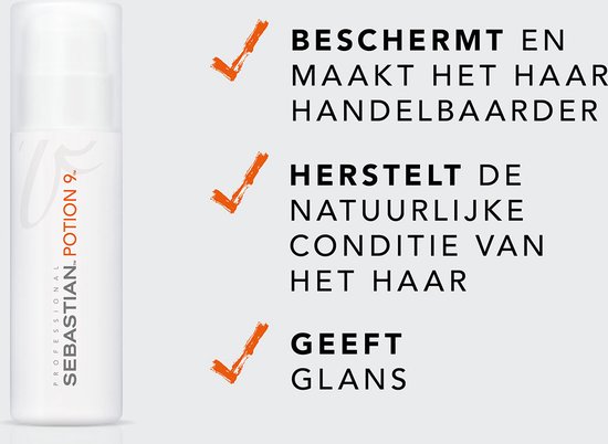 Sebastian Potion 9 is de perfecte leave-in stylingbehandeling. Deze leave-in bevat een mix van 9 botanische ingrediënten die het haar verzorgen van binnenuit en geven het haar natuurlijke veerkracht. Hierdoor wordt het model én de conditie van het haar verbeterd. De negen actieve oliën herstellen de natuurlijke conditie, door de haren van binnenuit te verzorgen en beschermen. Het haar krijgt een natuurlijke veerkracht, waardoor het haar makkelijk te restylen is. Dit multifunctionele product maakt de haren zichtbaar en voelbaar gezonder.
