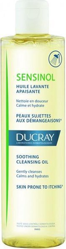 Ducray Sensinol Huile Lavante Apaisante Kalmerende reinigingsolie helpt met behulp van een extra sterk werkzame stof een normale of droge huid die jeukend of geA rriteerd aanvoelt meteen te verzahcten De uistekende formule die is samengesteld om het risico op allergische reacties tot een minimum te beperken reinigt de huid in alle zachtheid werkt hydraterend en neutraliseert hard leidingwater Bevat geen zeep en is hypoallergeen Gebruik Op de natte huid aanbrengen afspoelen en droogdeppen zonder te wrijven Geschikt voor dagelijks gebruik