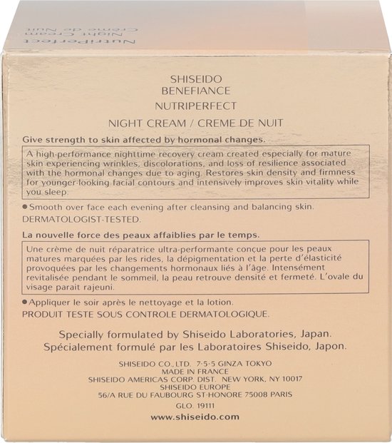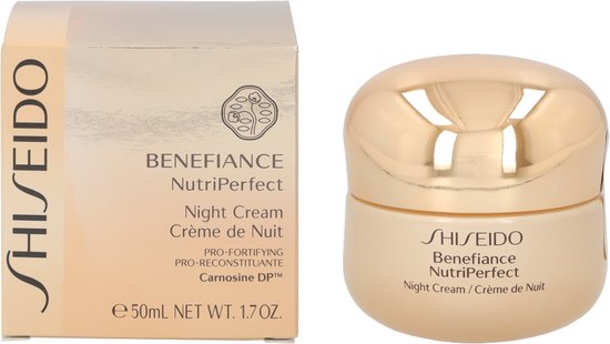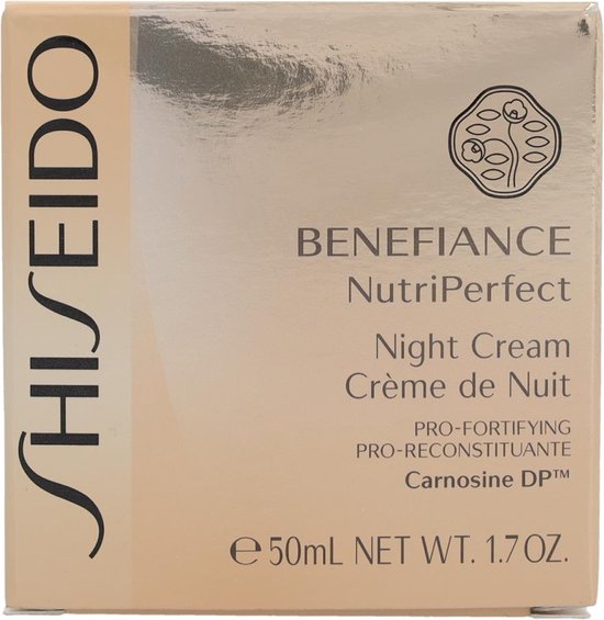 Shiseido Benefiance Nutriperfect Night Cream De producten uit de serie Benefiance Nutriperfect versterken de huid die wordt aangetast door hormonale veranderingen De nachtcrA me draagt bij aan het verbeteren van de huidtextuur de elasticiteit van de huid en werkt tegen rimpels en verkleuringen Voor een fris en vitaal uiterlijk bij het opstaan Dit product is dermatologisch getest Gebruik Na het reinigen en gebruik van de lotion gelijkmatig over het gezicht verdelen en inmasseren