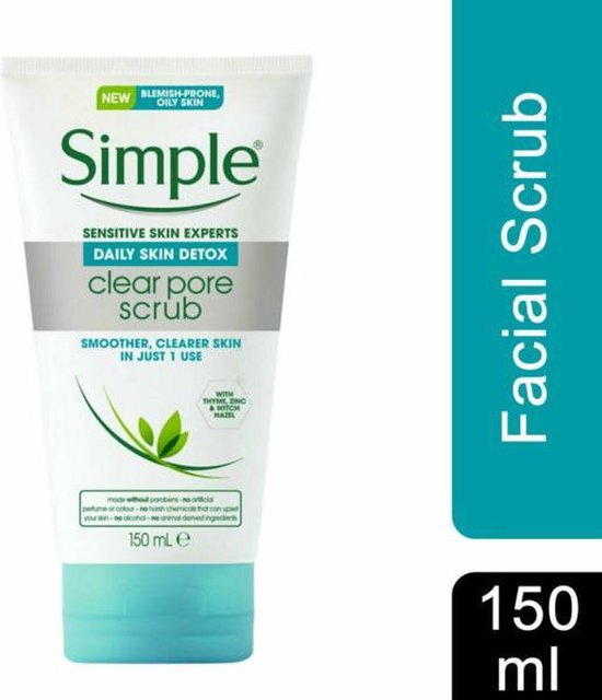 <p> Wanneer je huid te veel blootgesteld wordt aan invloeden en vervuiling van buitenaf, kan dit leiden tot overproductie van olie en talg, waarbij de poriën verstopt kunnen raken. Hierdoor kan je huid gevoelig worden en vatbaar zijn voor oneffenheden en vlekjes. Het is daarom belangrijk je huid grondig te reinigen met producten die effectief maar tegelijkertijd ook zacht zijn. Simple Daily Skin Detox Clear Pore Scrub is dé oplossing wanneer je op zoek bent naar effectieve, maar tegelijkertijd ook een huidvriendelijke en zachte manier om je gezicht te reinigen.<br /><br />Gebruik deze scrub twee tot drie keer per week voor optimaal resultaat. De gezichtsscrub bevat geen kunstmatige geur- en kleurstoffen. De formule is huidvriendelijk.<br /><br /> </p>