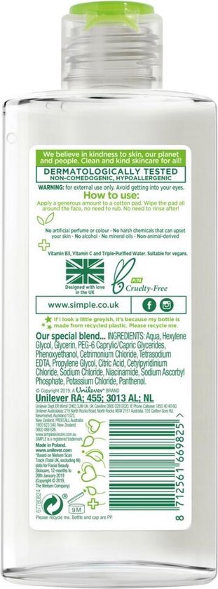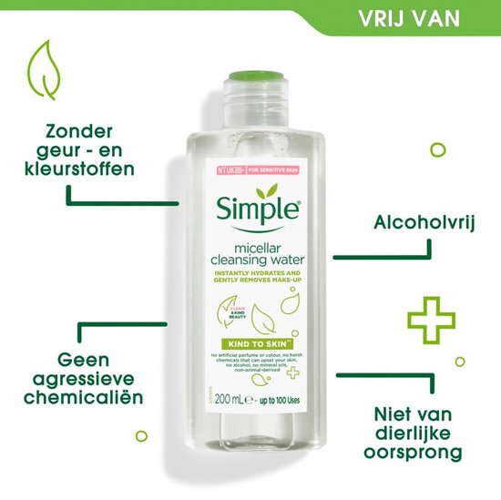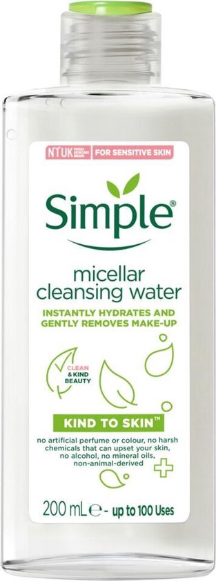 De Simple Reinigingswater Micellair hydrateert en reinigt jouw gezicht, ook de gevoelige huid. Deze grondige en doeltreffende reiniger bevat micellen; dit zijn reinigingsbubbels die slim genoeg zijn om op een zachte, maar zeer effectieve wijze make-up en onzuiverheden te verwijderen, vertopte poriën schoon te maken en tegelijkertijd de huidhydratatie tot 90% verhogen. Dit is een huidvriendelijke formule gemaakt met multivitaminen en drievoudig gezuiverd water die je fris laat aanvoelen en zorgt daarnaast ook voor een natuurlijke gezonde look. De reiniginswater bevat geen kusntmatige geur- en kleurstoffen.