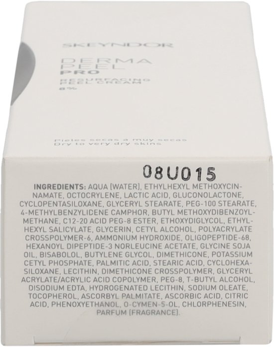 Skeyndor Resurfacing Peel Cream is een scrubgel met Alpha Hydroxy zuren en biologische peptides. Deze gel verwijdert dode huidcellen en overtollig talg en stimuleert de productie van nieuwe huid. Je huid wordt daardoor zachter en straalt meer. De huid wordt direct zachter en de huid wordt beschermd tegen de schadelijke UV straling met een Sun Protection Factor 20. Deze crème is voornamelijk geschikt bij een droge huid en is minder geschikt bij een gevoelige huid.