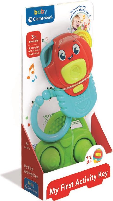 <p>Een interactieve elektronische sleutel en zijn bijtbare sleutelhanger. De sleutel stimuleert de auditieve waarneming van het kind met muziek en geluiden, en betrekt het kind door imitatie. De van zacht materiaal gemaakte sleutelhanger ontwikkelt de fijne motoriek en de sensorische tastzin van het kind. Ontdek al het imitatiespeelgoed van de Baby Clementoni lijn. Interactief, elektronisch spel, ontworpen voor de ontwikkeling van het kind in de eerste levensjaren.</p>