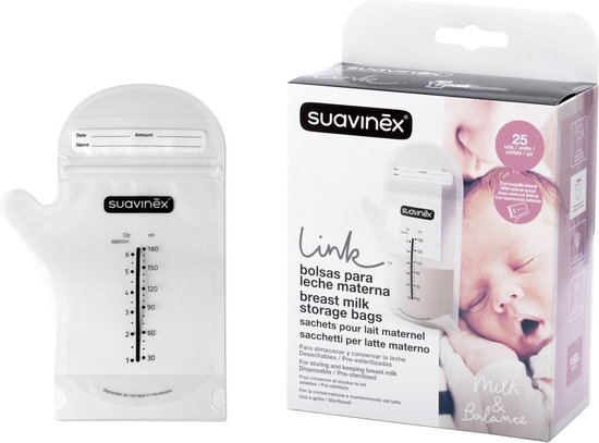 Bovenop het zakje zit een etiket waarop je de datum van het afkolven kan schrijven. De inhoud van het zakje is 180 ml. Er zitten 25 stuks in een verpakking van Suavinex.