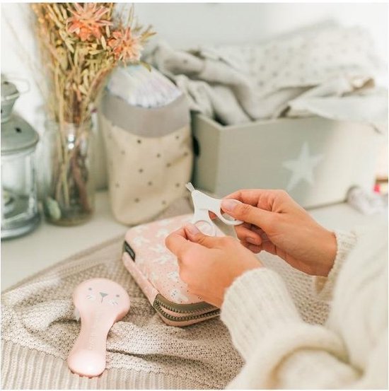 Hygge toilettas-organiser met 6 essentiële producten om de verzorging te vergemakkelijken die de baby vanaf de eerste dag.