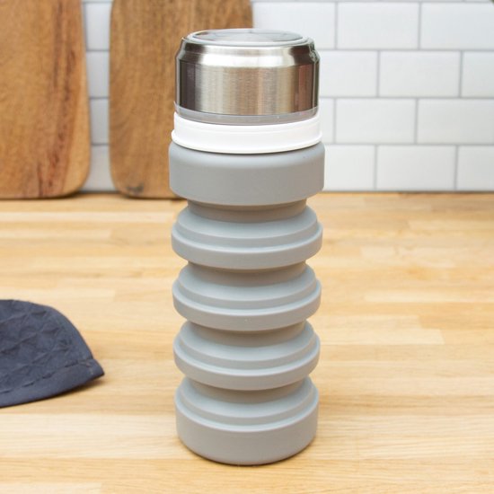 Opvouwbare waterfles van Suck UK. Waterfles die opgevouwen kan worden. Siliconen waterfles in het grijs, die opvouwbaar is om ruimte te besparen. De opvouwbare waterfles is makkelijk om mee te nemen en neemt weinig ruimte in. Wil je hem helemaal vullen, dan trek je hem uit en heeft de Collapsible Water Bottle van Suck UK een inhoud van 400 milliliter. Afmeting van de ingevouwen fles: 12 x 6,7 x 6,7 centimeter. Met dop van roestvrij staal.