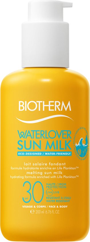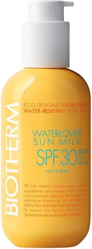 Biotherm Sun Waterlover Sun Milk SPF 30 Deze comfortabele zonnebrandmelk kan voor zowel het gezicht als het lichaam worden gebruikt Dit product is milieuvriendelijk dankzij zijn SPF filters en zijn ecologisch parfum en verpakking De zonnemelk voelt heerlijke comfortabel en smeltend aan en laat geen witte laag achter op de huid Factor 30 Gebruik Breng de zonnebrandmelk vlak voor het zonnen aan op de huid Breng regelmatig opnieuw aan vooral na het zwemmen transpireren of afdrogen