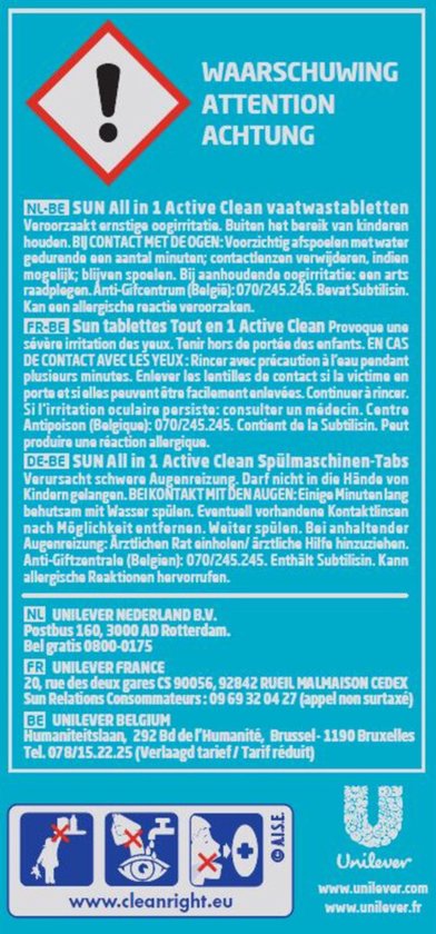 • Met Sun Active Clean All-in 1 vaatwastabletten is voorspoelen niet nodig