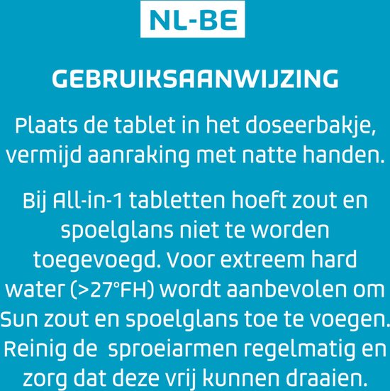 Het toegevoegde zout zorgt ervoor dat het water gedurende het proces wordt verzacht en er geen kalkaanslag op het glaswerk ontstaat. De spoelglans geeft een streeploos resultaat. Een vaatwastablet is voldoende om je vaat heerlijk fris te laten ruiken.