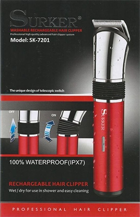 Surker Wasbare oplaadbare tondeuse van Superior kwaliteit. Met Unieke telescopische aan en uit knop. Tevens te gebruiken onder de douche en gemakkelijk schoon te maken. Het apparaat heeft een mooi design.