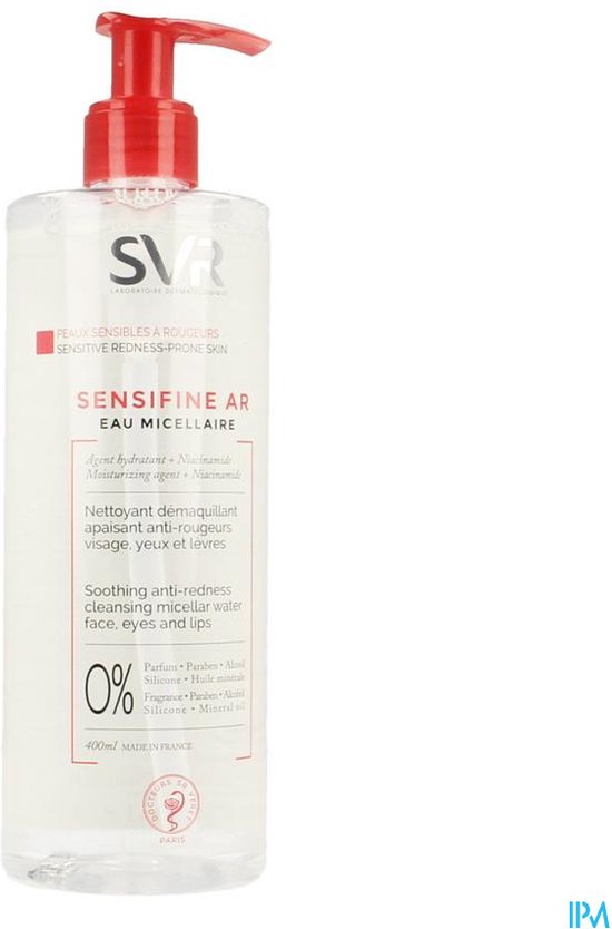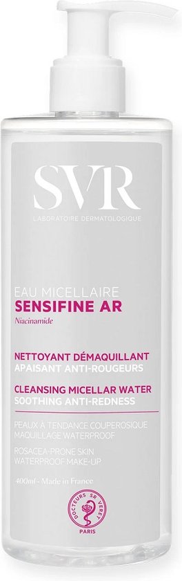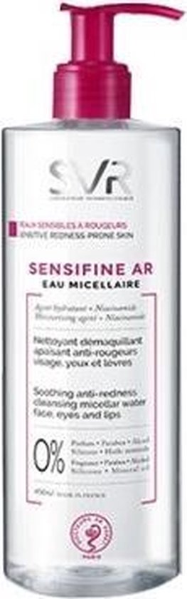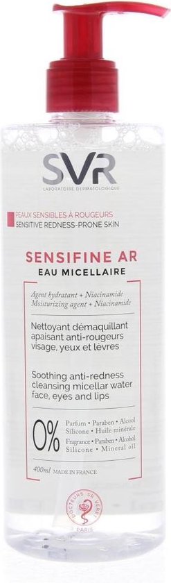 SVR Sensifine AR Eau Micellaire Reinigingswater met een kalmerend en anti roodheid effect Verwijdert alle make up zelfs waterproof Verlicht de gevoelige huid met neiging tot couperose en kalmeert een gloeiend gevoel Bevat geen parfum en alcohol Kan gebruikt worden door contactlens dragers Gebruik Aanbrengen met een wattenschijfje Niet afspoelen